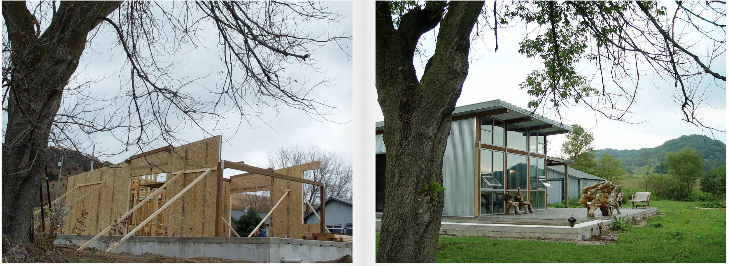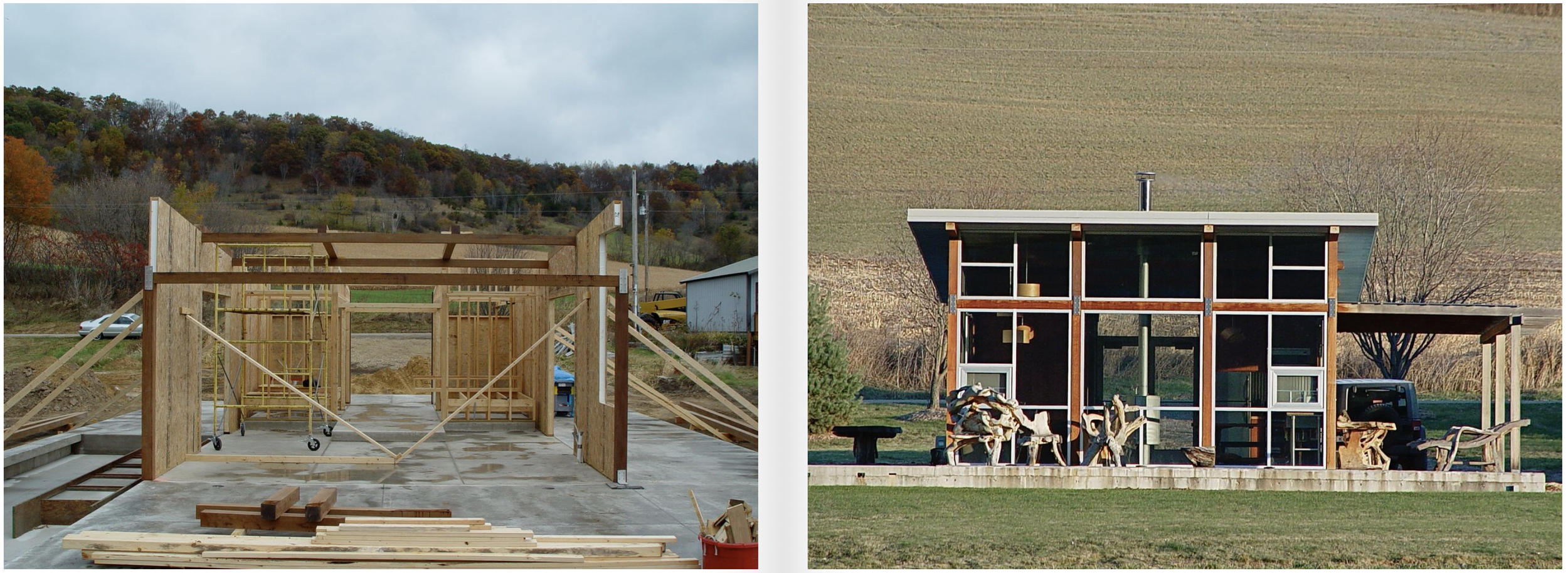 We designed this modern cabin and built it from the ground up, on a remote location in Western Wisconsin’s driftless area. The cabin features a hydronic heated slab, while the walls and ceiling are Structural Insulated Panels (SIPs). Sliding galvalume panels cover the doors and windows, completely sealing up the building when not in use. A reflecting pool bounces afternoon sunlight patterns through the interiors.